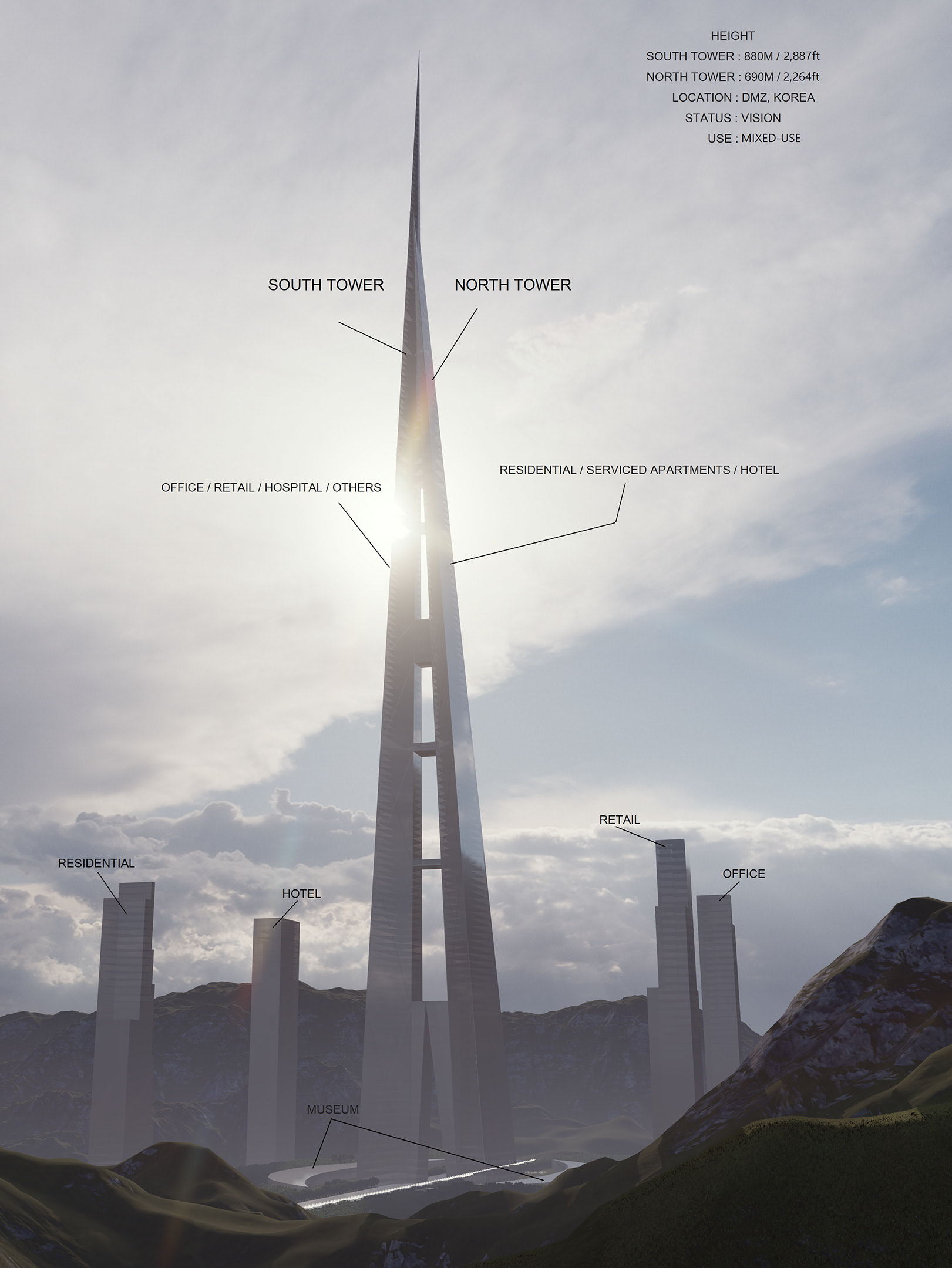 Korea's 880-meter skyscraper symbolizing division, pain, and unification of South and North Korea