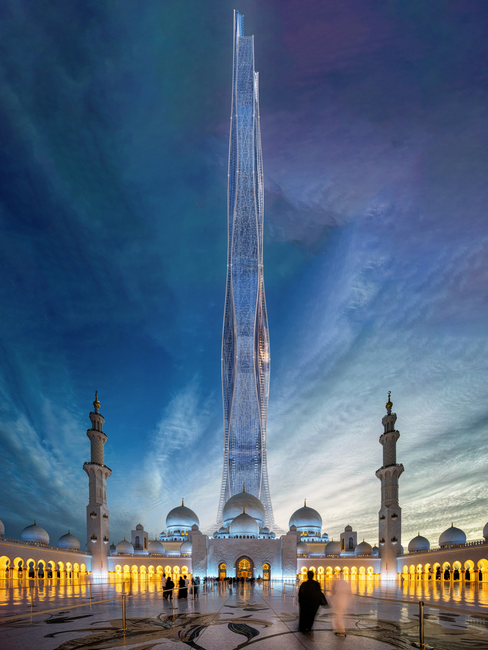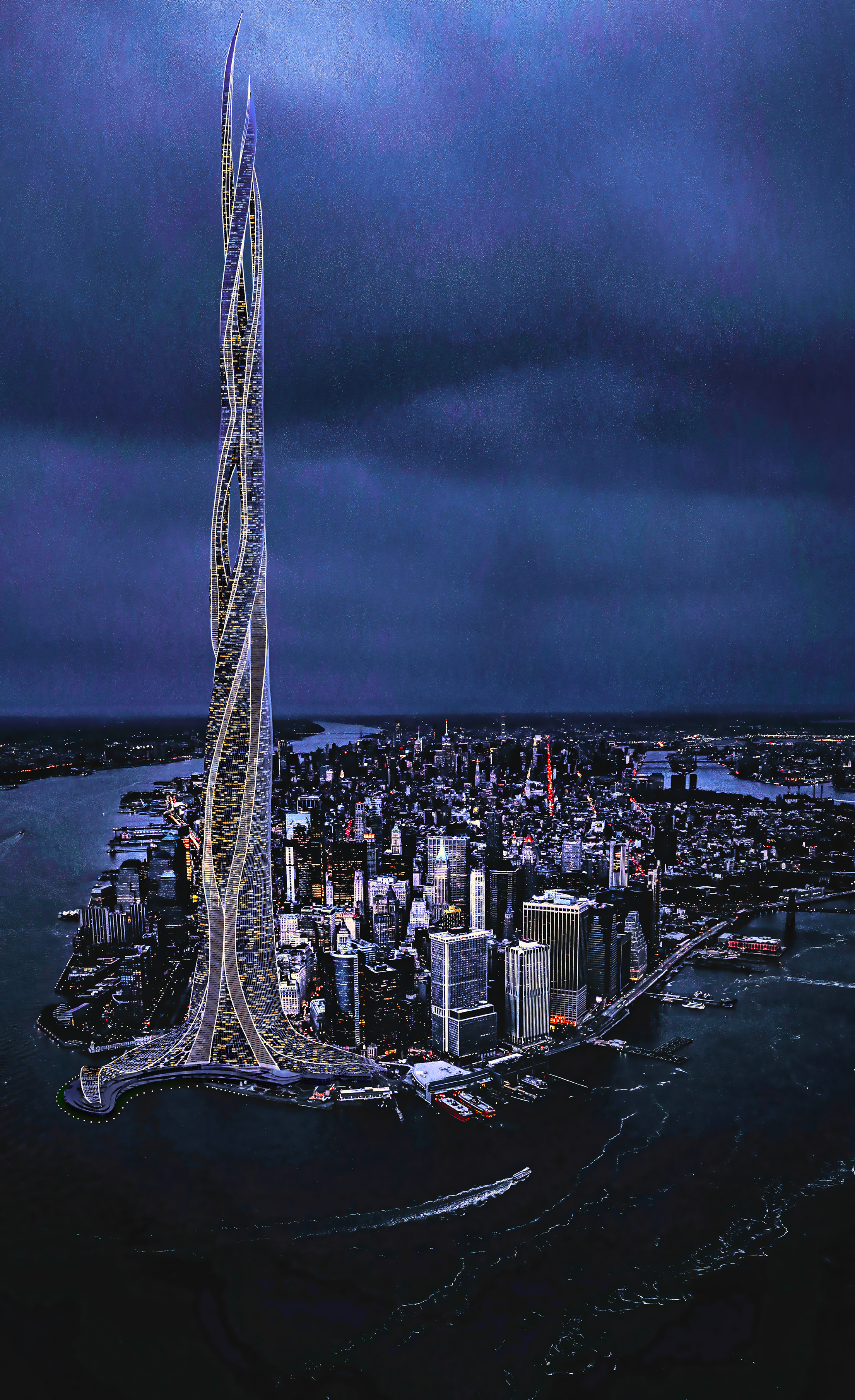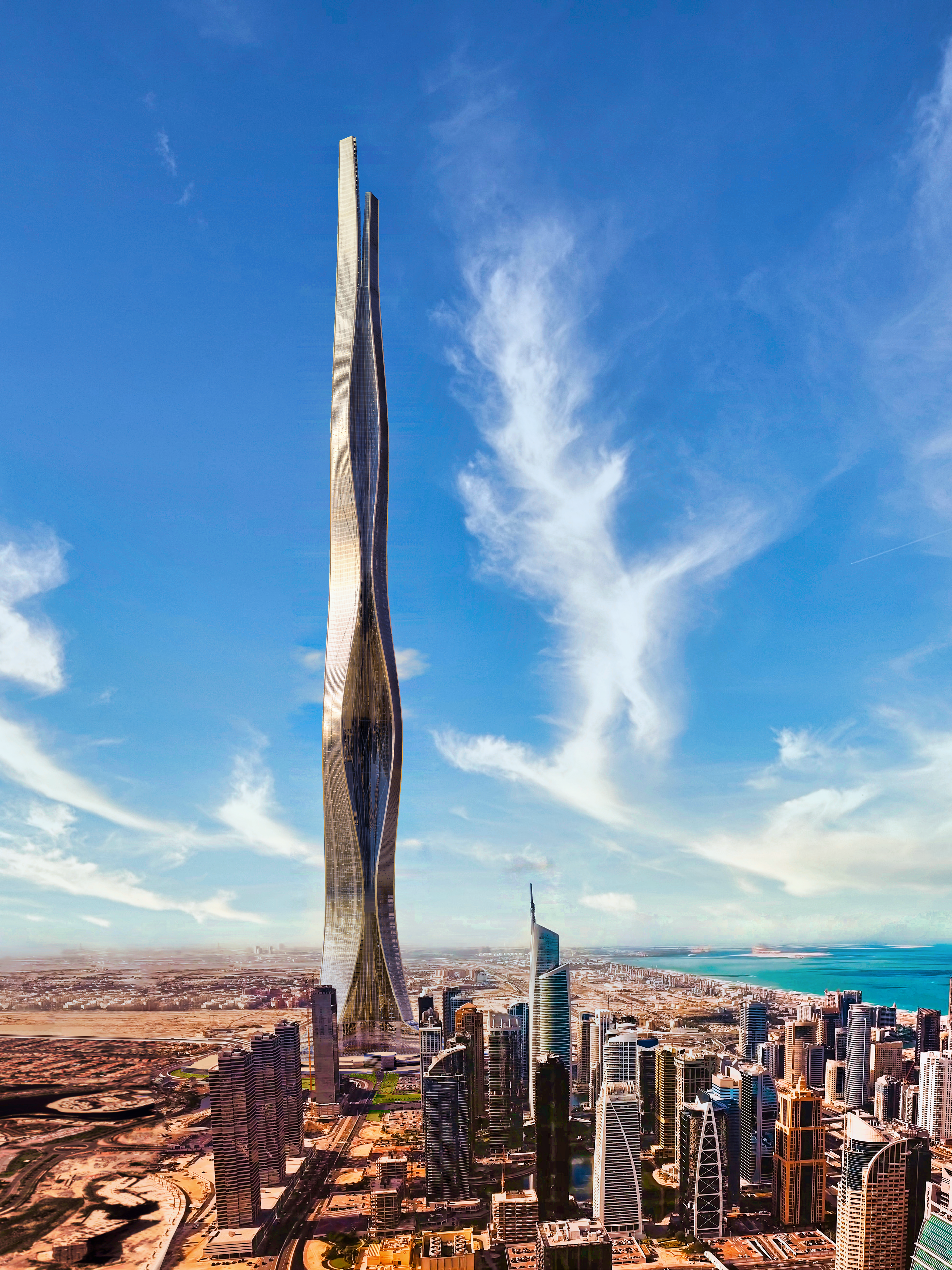 Burj 2020 / Uptown Dubai District concept. Seven supertall towers combine into one huge 1km tower.