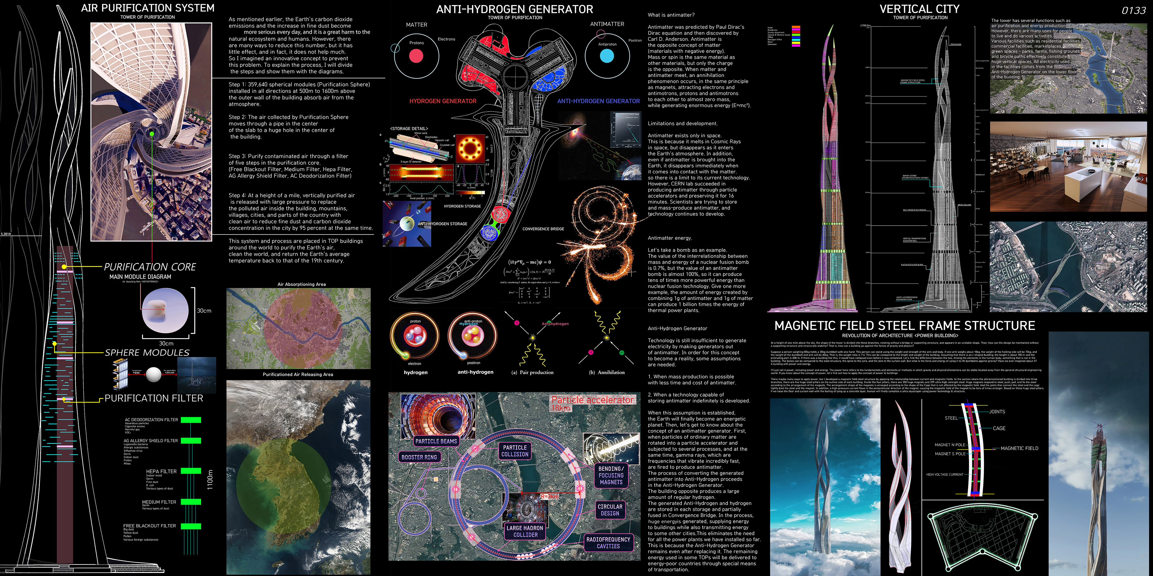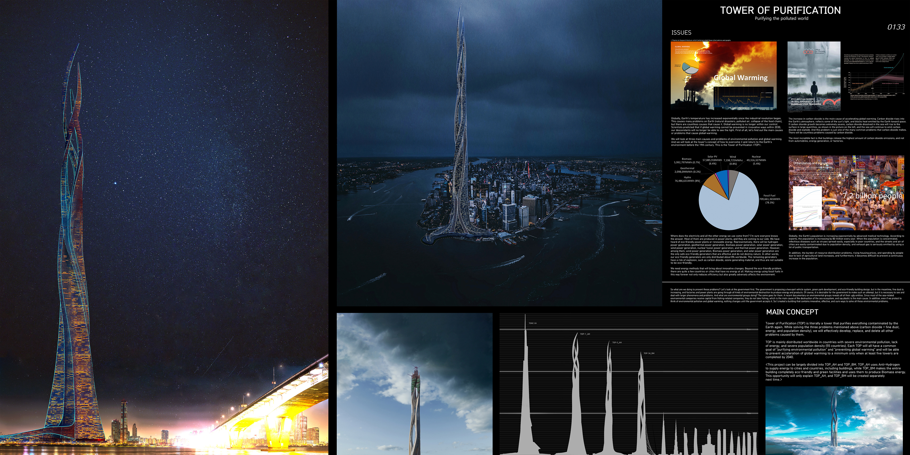 TOP (Tower of Purification) located the cities where has a lot of problems related with global warming. It solves all three main causes of warming, has a common goal of "preventing global warming" and "returning the Earth's environment to before the 19th century". It also has fine dust purification technology, energy mass production, and various residential facilities.